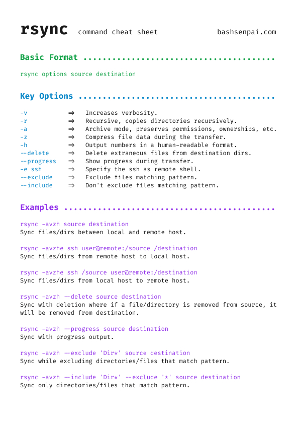 | -a | Archive mode, preserves permissions, ownerships, etc. |